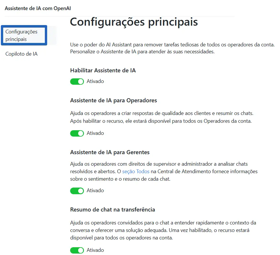 A utilização do assistente de IA está disponível para todos os operadores que possuam uma licença e diferentes habilidades podem ser usadas para diferentes canais. Quando a habilidade for alterada, seu estilo de resposta também irá mudar.