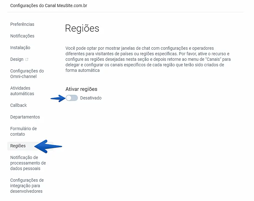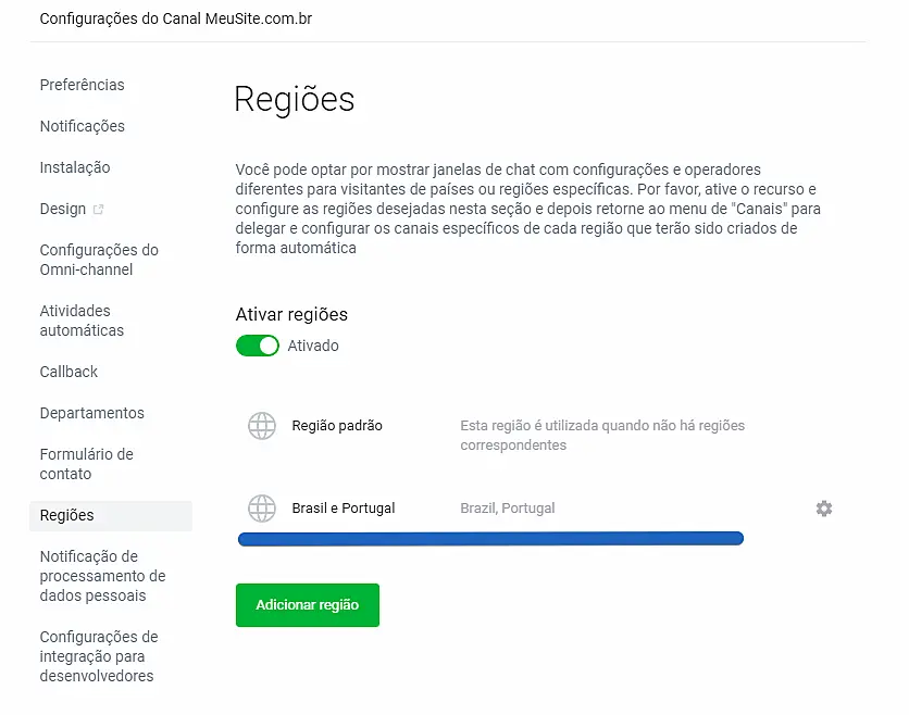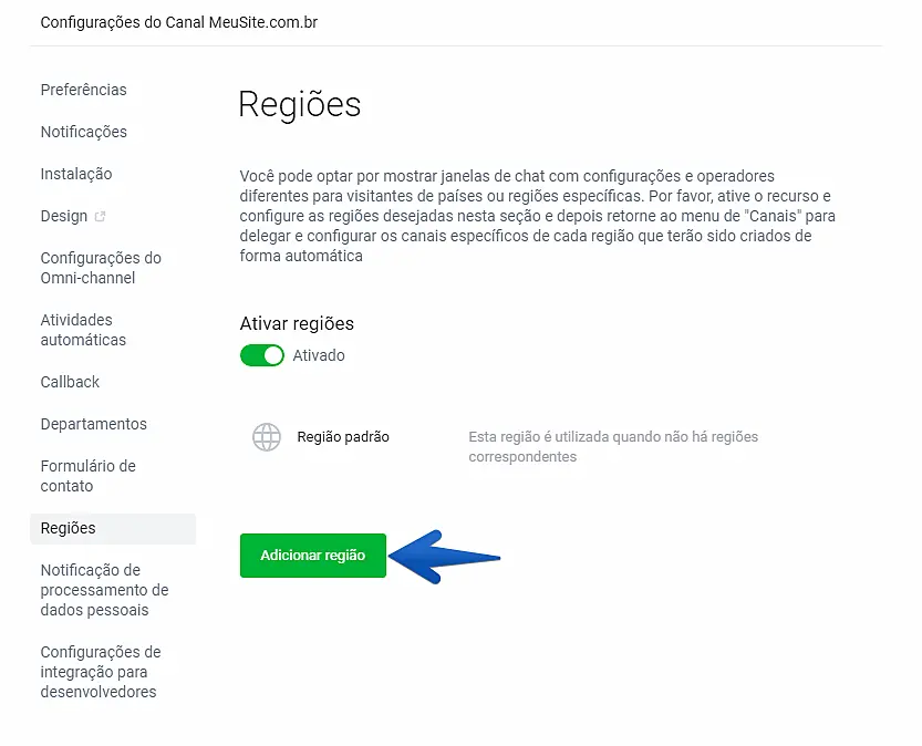 O recurso "Regiões" pode ser utilizado para encaminhar um visitante para o departamento mais próximo dependendo da sua localização. No menu "Regiões", você pode configurar os operadores responsáveis por cada região.