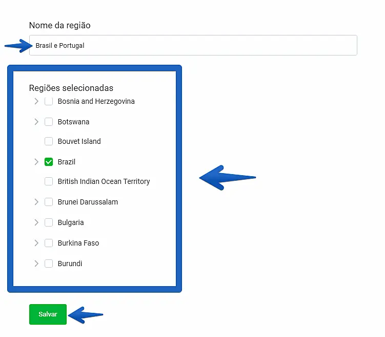 Insira um nome e selecione os Países/Estados que farão parte da nova região que está sendo criada.