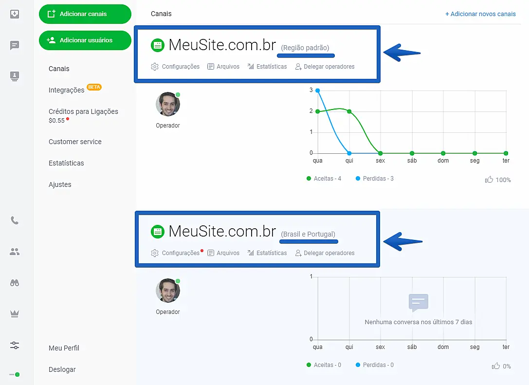 Retornando ao menu "Canais", você notará que cada região criada agora possui um canal separado. Cada canal possui estatísticas, operadores e configurações separadas (atividades automáticas, textos, design e etc.).