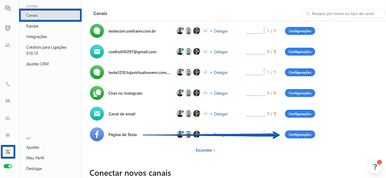 1.Acesse seu aplicativo web do JivoChat e vá até Configurações -> Canais -> Configurações (ao lado do canal da página do Facebook integrada ao JivoChat).