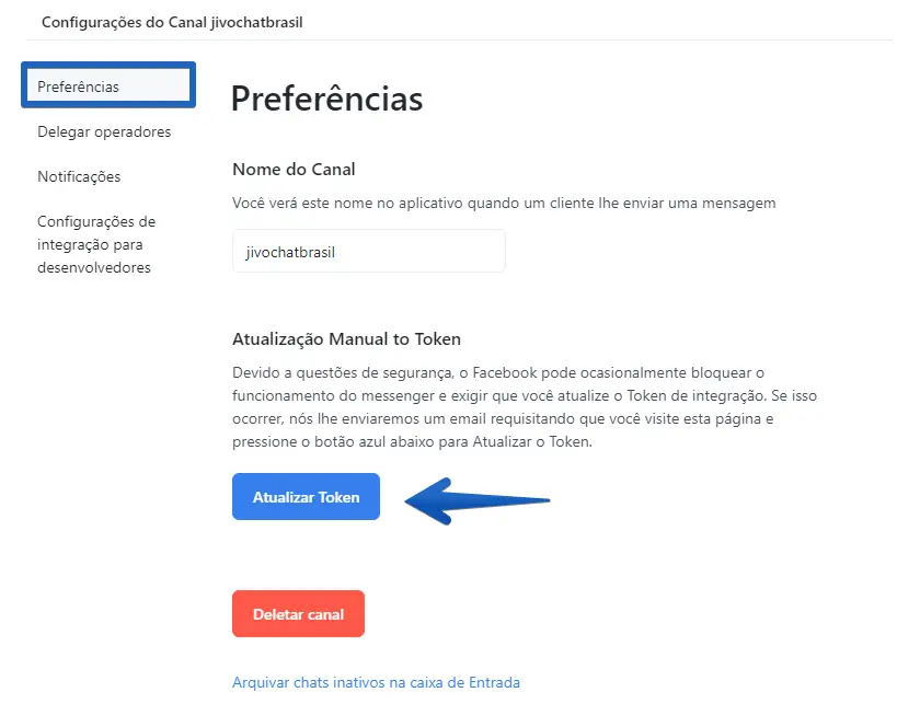 Passo 2: Para atualizar o token, acesse o menu "Preferências" e selecione "Atualizar Token".