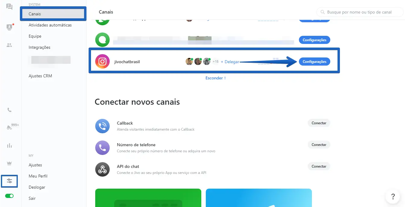 Passo 1: Para acessar as configurações do canal do Instagram integrado ao JivoChat, abra o aplicativo web do JivoChat, clique em "Configurações", em seguida, selecione "Canais" e, por fim, escolha "Configurações" (que fica localizado ao lado do canal do Instagram).