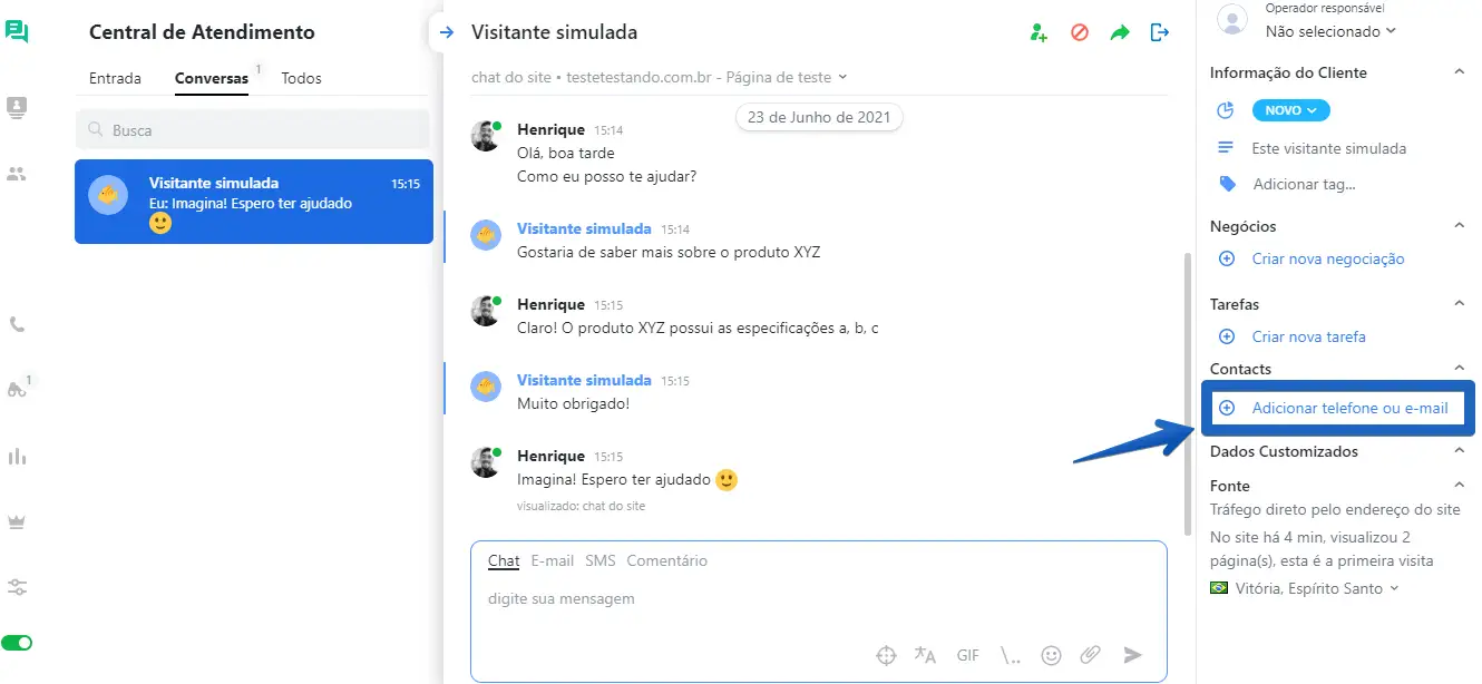 Durante uma conversa, você pode manualmente adicionar o e-mail de contato do cliente no painel à direita para salvar os dados de contato daquela pessoa.
