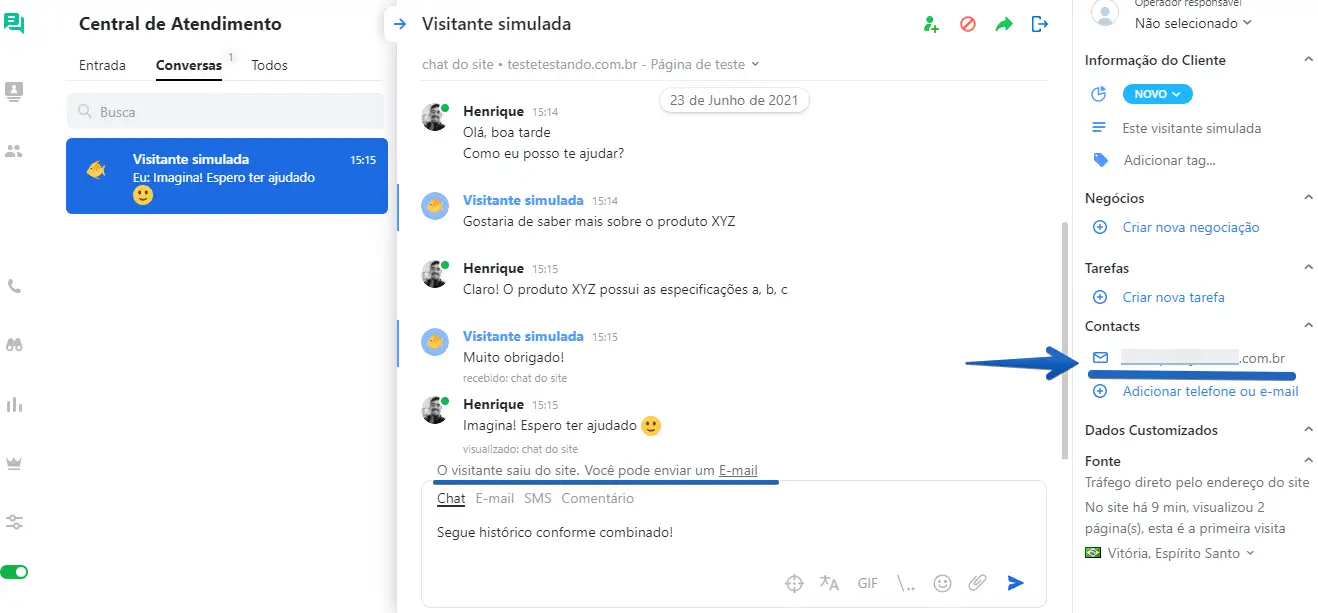 Após inserir o e-mail, assim que o cliente sair do seu site você notará uma nova mensagem do sistema sendo mostrada dentro da conversa e poderá enviar mensagens extras diretamente para o e-mail do cliente.