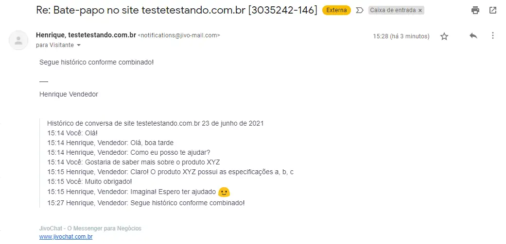 Pronto. O último histórico de conversa será enviado para o e-mail do cliente dentro de poucos minutos juntamente com a mensagem extra que escrevemos.