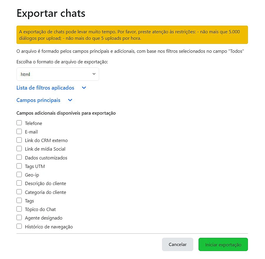 - Campos que deseja ver no arquivo com chats (os campos principais estão disponíveis por padrão [ID do cliente, nome do cliente, canal de comunicação, link para o cliente, número de solicitações, data de início do chat, velocidade de resposta, duração do chat bate-papo, classificação, comentário na classificação, link para a caixa de diálogo], você também pode selecionar campos adicionais)