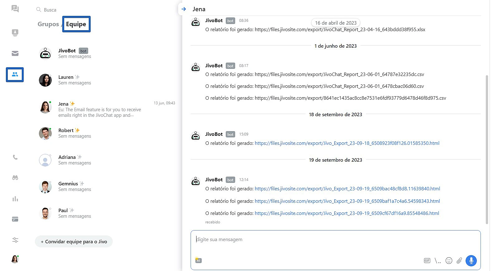 A formação do arquivo pode levar um tempo, o arquivo ficará disponível na seção "Equipe" do chat com JivoBot (basta aguardar notificação)