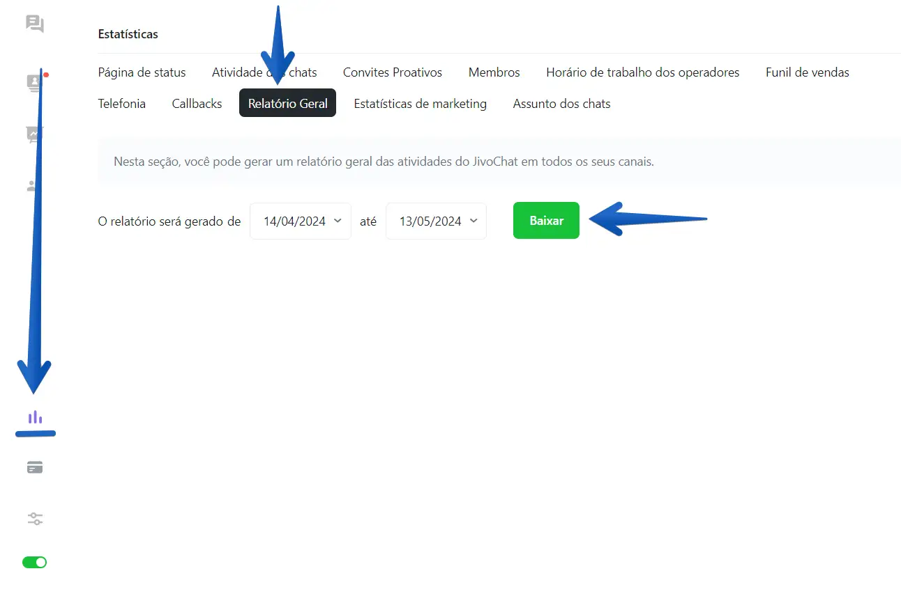 - Acesse o aplicativo web do JivoChat, ou um de nossos aplicativos Desktop, e clique em Estatísticas → Relatório Geral.