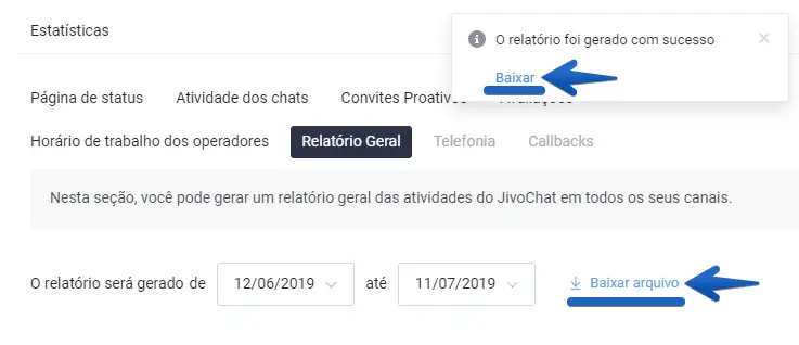 Recomendações: gere o relatório com no máximo 90 dias de dados estatísticos do trabalho da sua equipe no app JivoChat para evitar qualquer sobrecarga na hora de baixá-lo, pois quanto mais dados tiverem no relatório, maior será a demora ao baixá-lo.