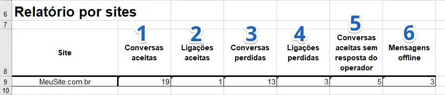 - Tempo de resposta médio (em segundos) - tempo médio em que o operador tomou para dar a primeira resposta ao visitante/cliente. Este tempo é contado desde o momento em que é enviada a primeira mensagem do visitante até o momento em que o operador envia a primeira mensagem no chat.