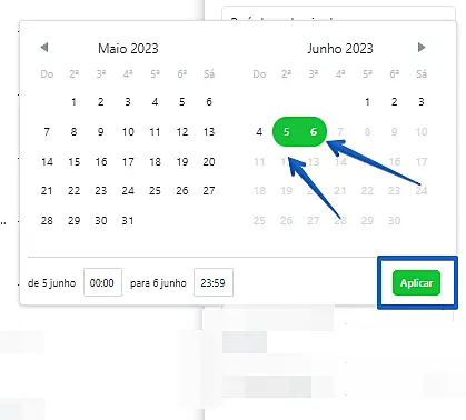 Em seguida, selecione a data do dia anterior (5, por exemplo) e a do dia atual (6, por exemplo) -> Clique em "Aplicar"