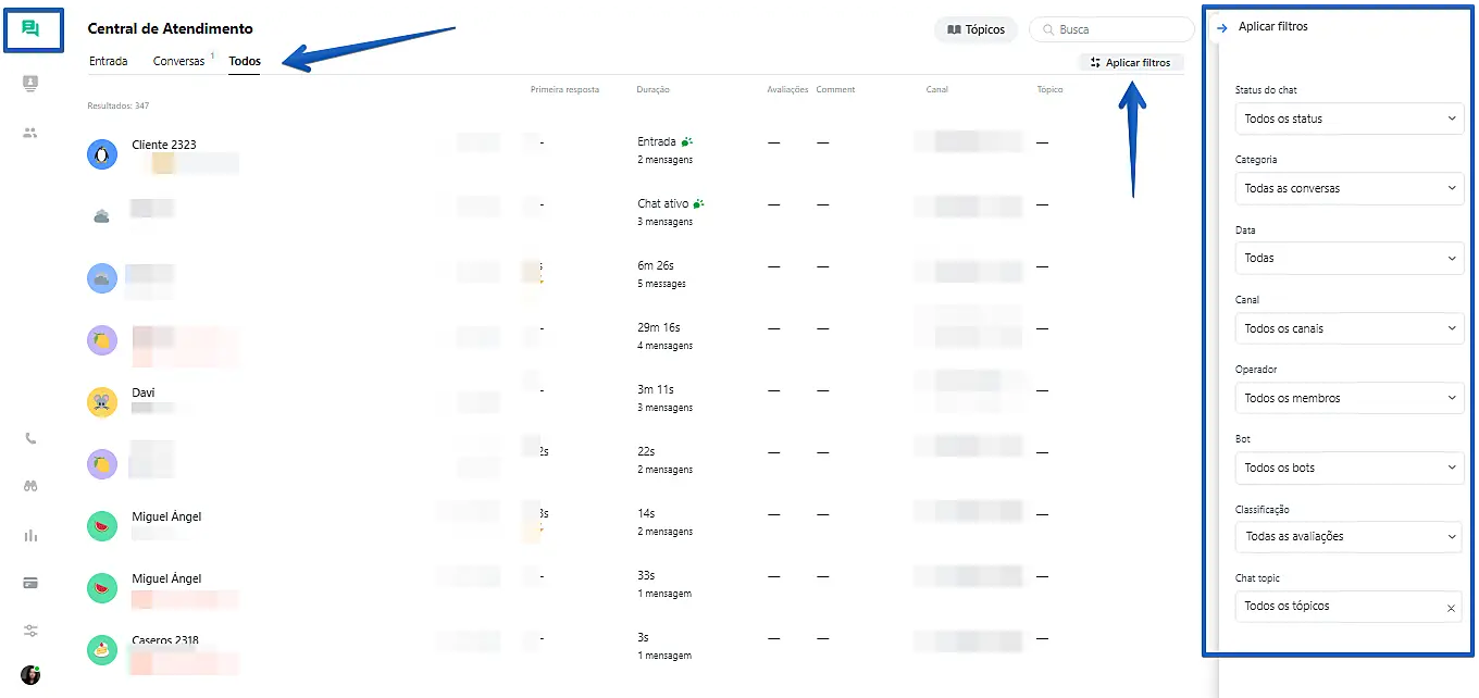 Passo 1: Clique em "Central de atendimento" -> "Todos" -> "Aplicar filtros"