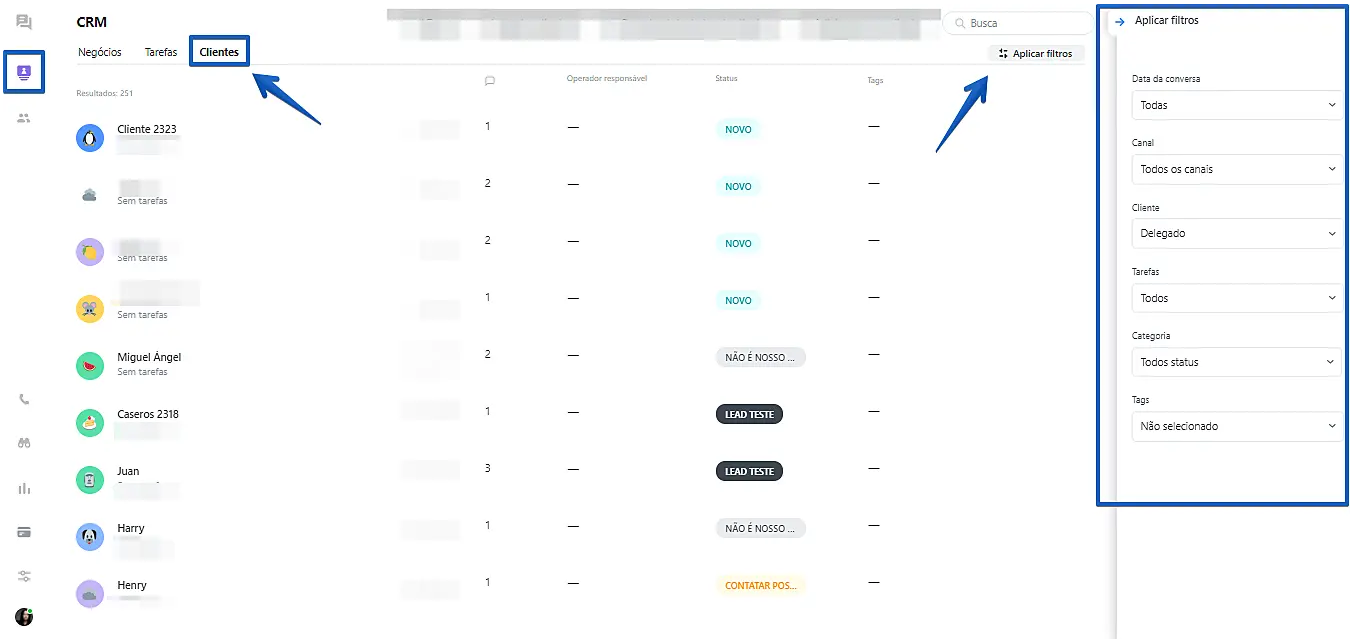 - Tarefas: você pode filtrar por atendimentos com tarefas atrasadas, concluídas ou os que não tenham tarefas.
