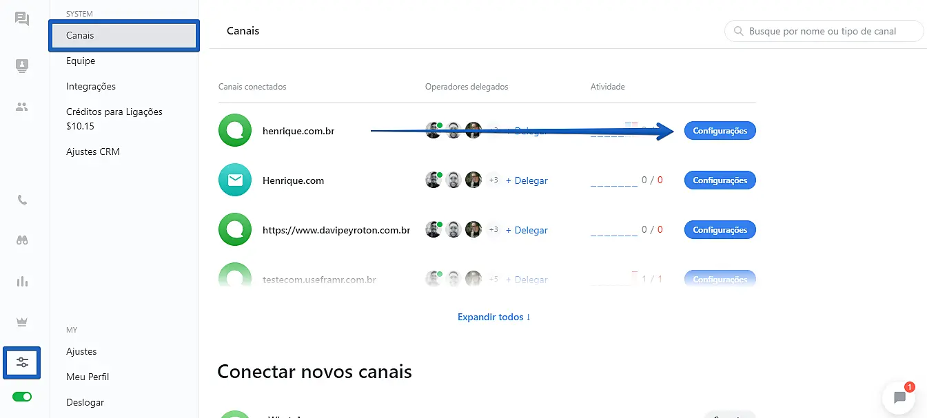 Para habilitar a visualização das mensagens sendo digitadas pelos visitantes para seus operadores antes que eles enviem as mensagens clicando em "enviar", abra seu aplicativo web da JivoChat ou um de nossos aplicativos Desktop e clique em Configurações -> Canais -> Configurações (ao lado do nome do seu site):