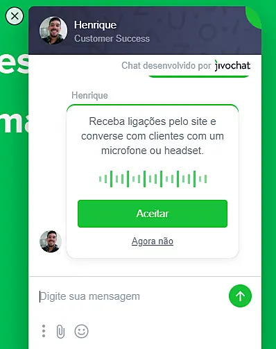 Quando o cliente clica no botão Aceitar, uma nova guia ou pop-up é aberta, dependendo do navegador. Se o cliente clicar em Agora não, a chamada será rejeitada você verá o evento de chamada mal sucedida no histórico de bate-papo.