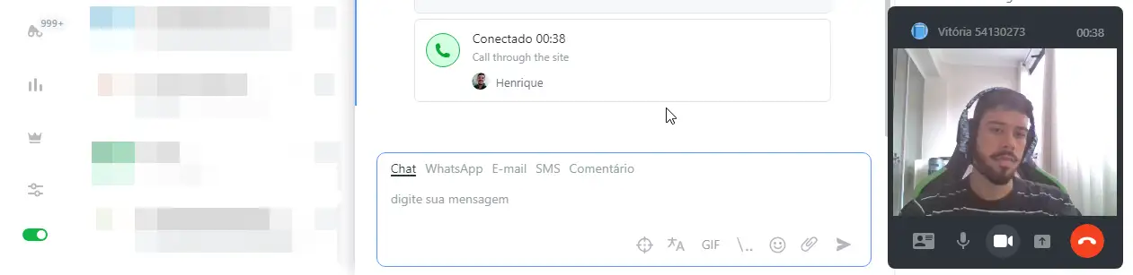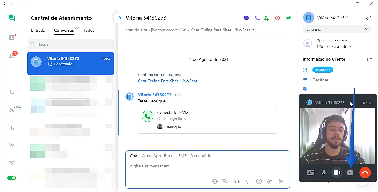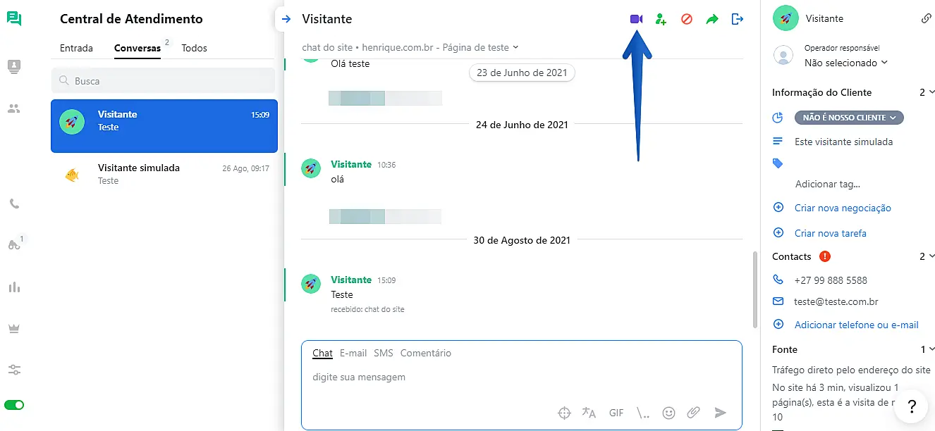 Para fazer uma chamada de vídeo, você precisará clicar no botão de chamada de vídeo localizado no canto superior direito do chat. A chamada só pode ser iniciada por um agente. Veja a imagem abaixo:
