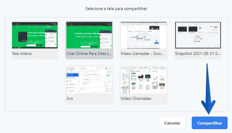 Selecione a tela inteira ou janela que deseja compartilhar e clique no botão Compartilhar