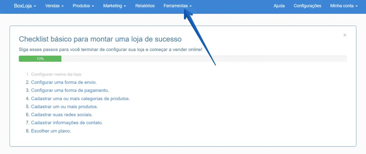 Primeiro, acesse o painel administrativo do seu site da Boxloja e clique no menu Ferramentas.