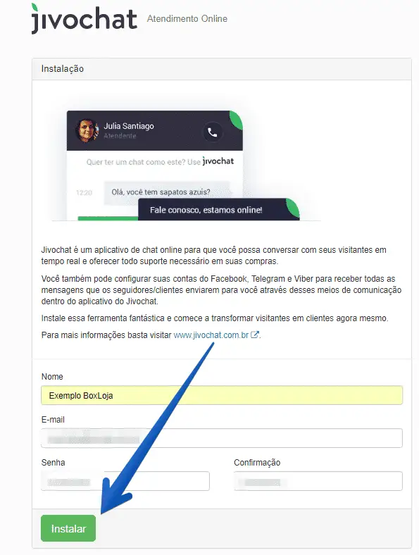Insira seu nome, e-mail, senha e confirmação da senha. Após o preenchimento, clique em Instalar para criar sua conta e instalar o JivoChat no seu site.