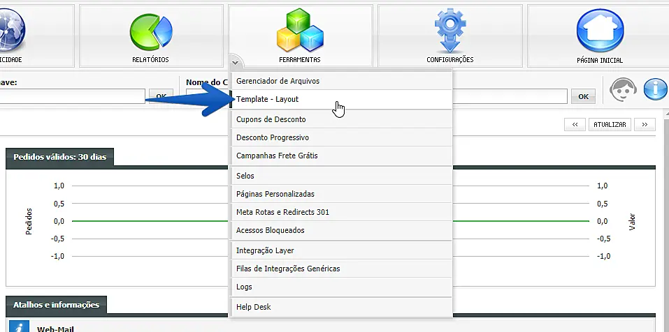 Primeiro, acesse o painel administrativo da EZ Commerce e acesse: Ferramentas -> Template - Layout.
