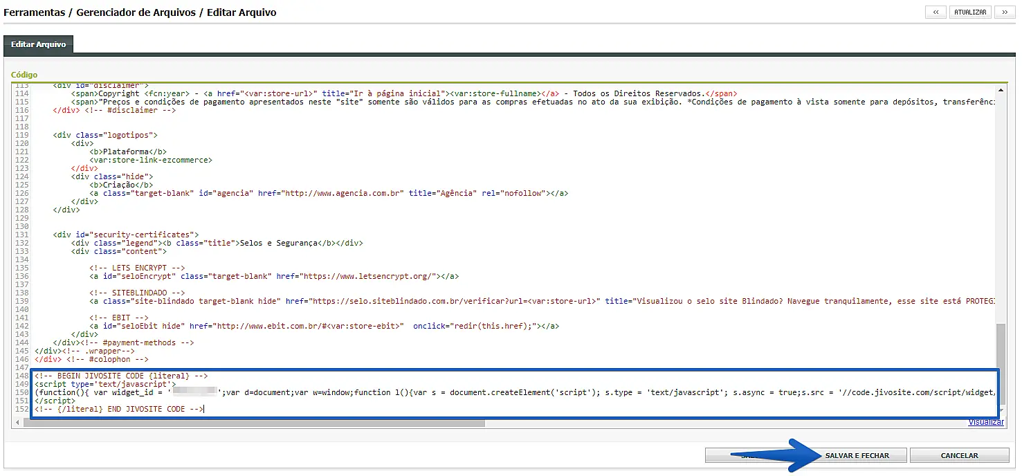Desça na página e cole o código do JivoChat no final do arquivo, como mostrado na imagem abaixo. Depois, clique em "Salvar e Fechar".