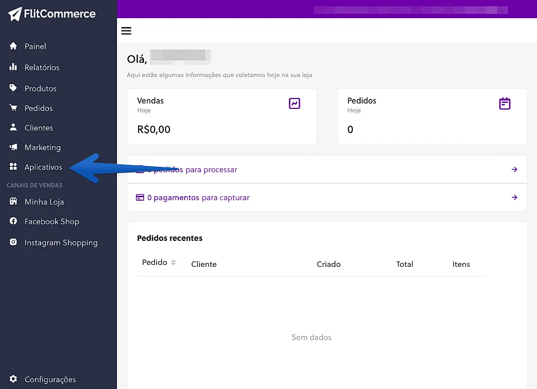 1. Acesse seu painel da FlitCommerce e clique Aplicativos.