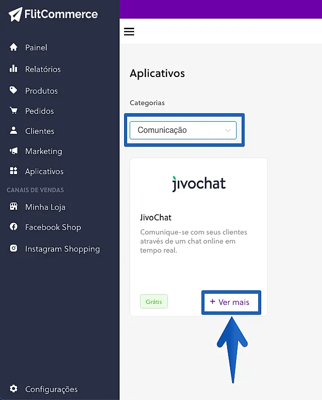 2. Selecione a categoria Comunicação, encontre o JivoChat e clique em + Ver mais.