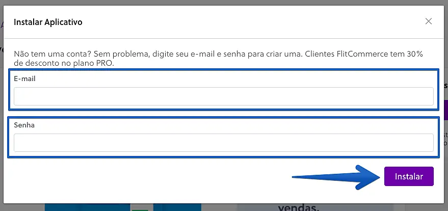 4. Caso você já tem uma conta no JivoChat, insira o seu e-mail e senha cadastrados. Caso você não tenha uma conta no JivoChat, insira o e-mail e senha que deseja associar a sua nova conta. Depois, clique em Instalar.