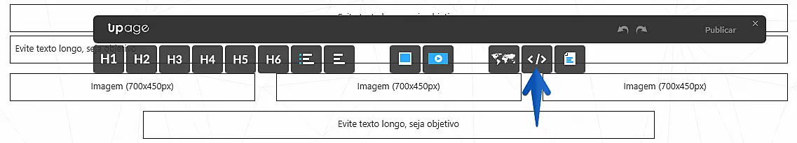 Primeiro, acesse o editor de páginas da Gpage e, no menu superior, selecione a arraste um elemento de código para inserir em seu site. Você pode inserí-lo em qualquer local, este elemento não será visível no site.