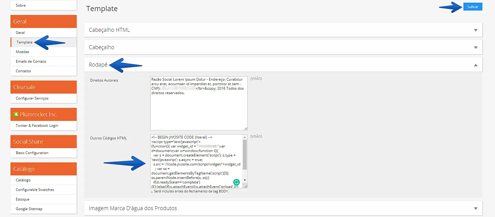 Primeiro, acesse o painel administrativo da JN2 e, no menu à esquerda, siga para: Template -> Rodapé -> Outros Códigos HTML -> Insira o código de instalação do JivoChat e clique em "Salvar" no canto direito superior.