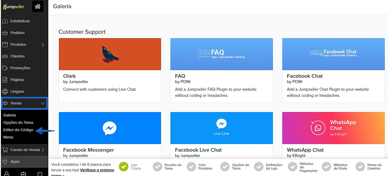 1. Acesse o painel administrativo da Jumpseller e, no painel à esquerda, acesse o menu "Temas" -> "Editor de Código".