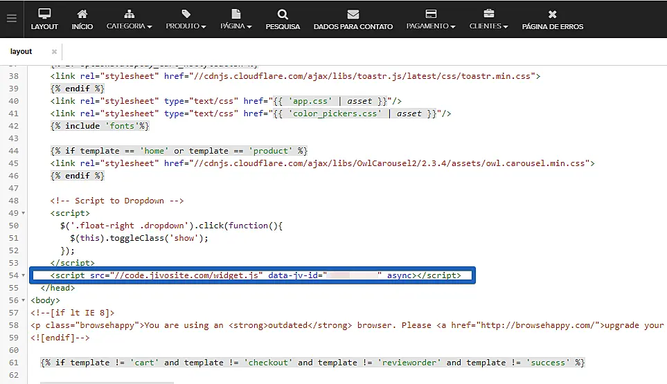3. Insira o código de instalação do JivoChat logo acima da tag </head>.