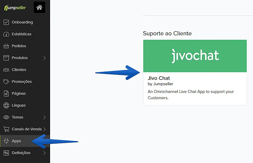 1. Acesse o painel administrativo da Jumpseller e, no painel à esquerda, acesse o menu "Apps" -> Encontre e clique no aplicativo "JivoChat".