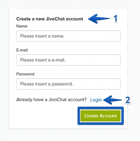 4. Caso já possua uma conta no JivoChat (2), siga para o próximo passo deste tutorial. Caso ainda não possua uma conta no JivoChat (1), insira um nome (nome do atendente - pode ser alterado depois), email e senha (mínimo de 6 caracteres - pelo menos 1 letra maiúscula e 1 número), clique em "Create Account" e siga para o passo 6 deste tutorial.