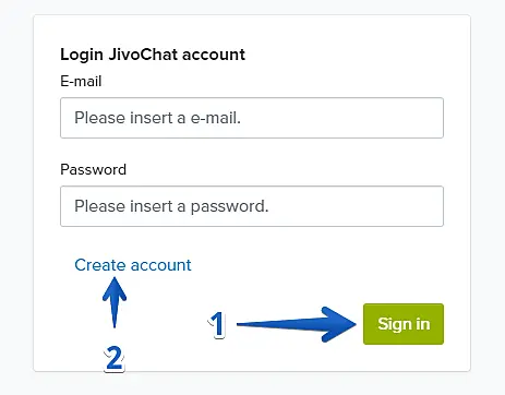 5. Insira seus dados de login da conta já existente no JivoChat e clique em "Sign in" (1). Se ainda não possui uma conta no JivoChat, clique em "Create account" (2) e confira o passo anterior do nosso tutorial.