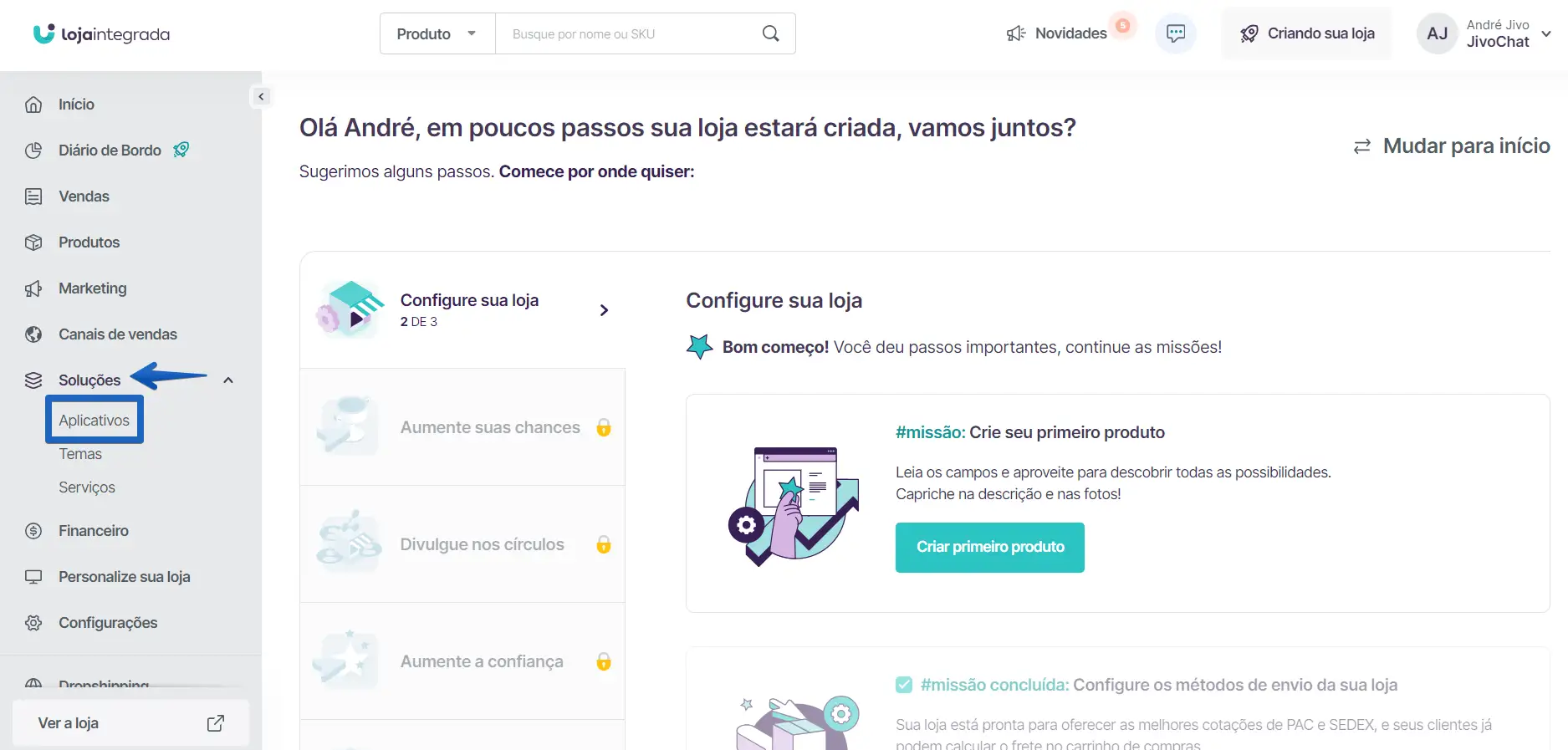 1º Passo: Acesse seu Painel da Loja Integrada e clique em Soluções -> Aplicativos