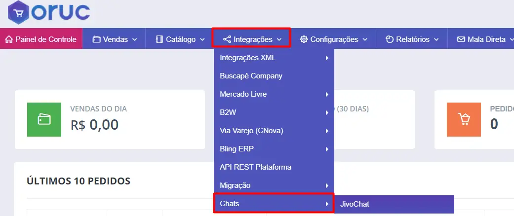 1. Primeiro, acesse o painel administrativo da Oruc e, no menu superior, siga para: Integrações -> Chats -> JivoChat.