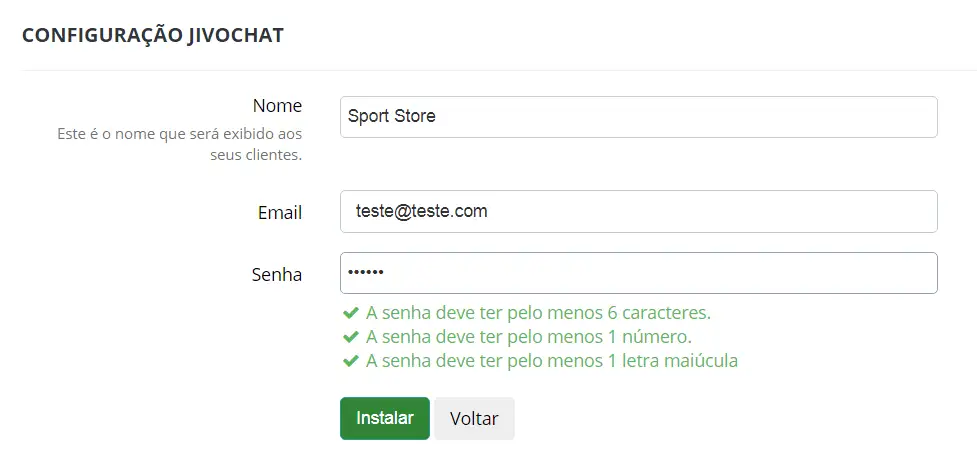 Caso não possua uma conta no JivoChat, clique em Instalar JivoChat na Loja (1).