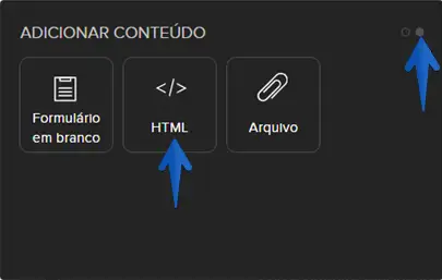 4.Em "Adicionar conteúdo", clique na bolinha para ver mais opções e selecione a opção HTML.