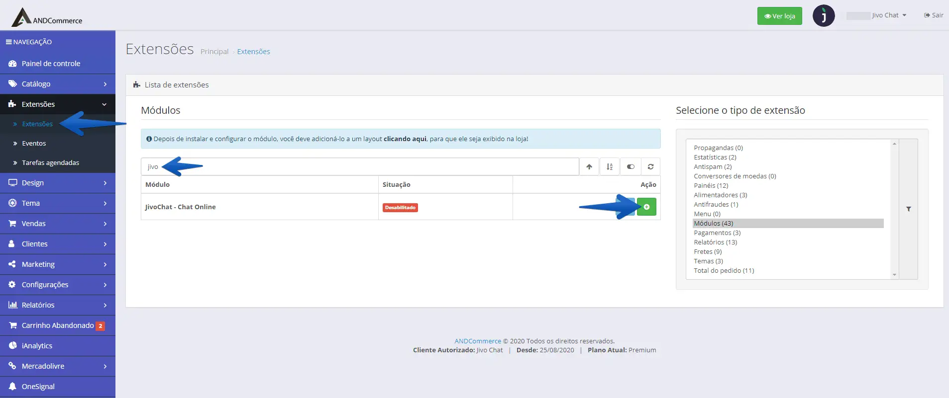 1. Acesse o painel administrativo do ANDCommerce e siga até Extensões -> Extensões -> Pesquise por JivoChat no campo de busca -> Instalar (botão verde).
