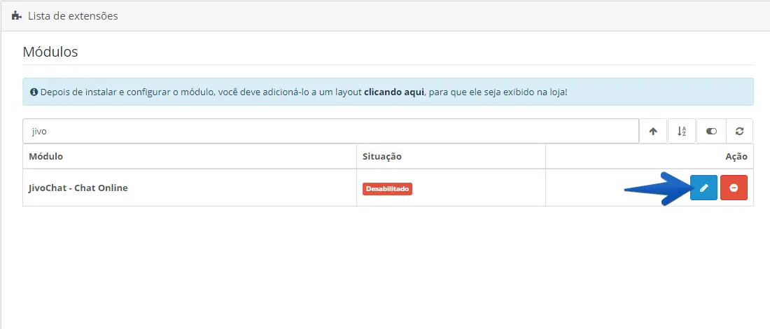 2. Após instalar, encontre novamente a extensão do JivoChat na lista e clique em Editar (botão azul).