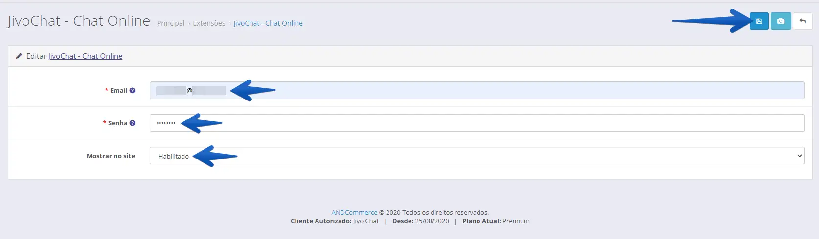 3. Caso já possua uma conta no JivoChat, insira seus dados de cadastro. Se ainda não possui uma conta no JivoChat, insira um e-mail e senha para criar uma nova conta. Marque a opção de "Mostrar no site" como Habilitado e clique em Salvar no canto direito superior para finalizar a instalação.