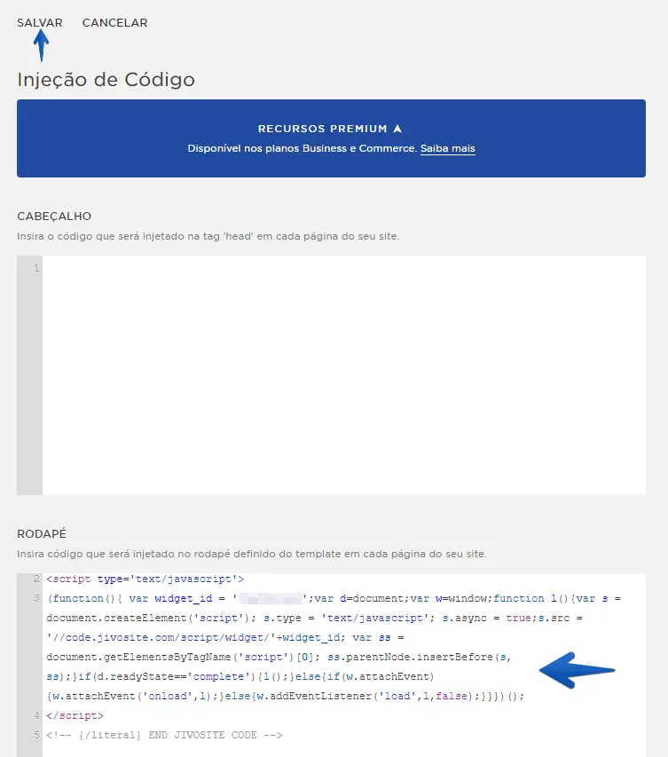 Cole o código de instalação do JivoChat na área do "RODAPÉ" e clique em "Salvar" no canto esquerdo superior.