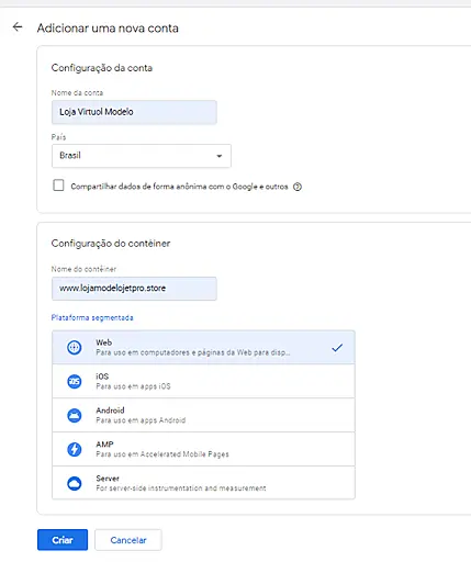 - Em "Configuração do contêiner", insira a URL do site e informe onde será usada a Tag do Google;