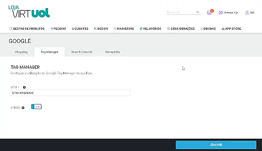 - Cole o código gerado no campo GTM e movimente o botão "ATIVO" para "SIM" e clique em "Gravar", conforme imagem abaixo.