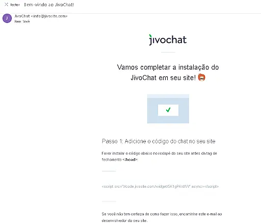 Acesse seu e-mail cadastrado no JivoChat e localize a mensagem enviada com o código html exclusivo de instalação para integrar com sua loja. Caso não localizar, faça o login no painel do JivoChat para encontrar seu código HTML para instalar o chat na sua loja. .Exemplo do e-mail abaixo:
