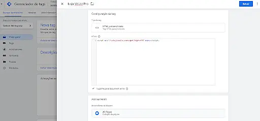 Copie o código html de instalação do JivoChat e cole em "HTML". Após, clique em "Acionamento", selecione a opção "All Pages" e depois clique no botão "Salvar", conforme a imagem abaixo:
