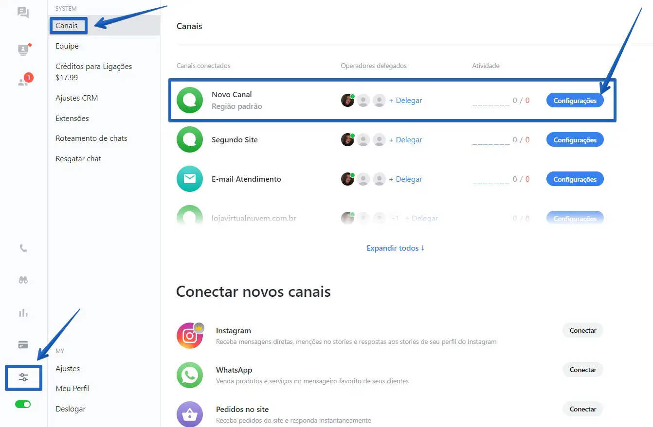 Dentro do aplicativo, clique em "Configurações" -> Canais -> Configurações (ao lado do canal do seu site).