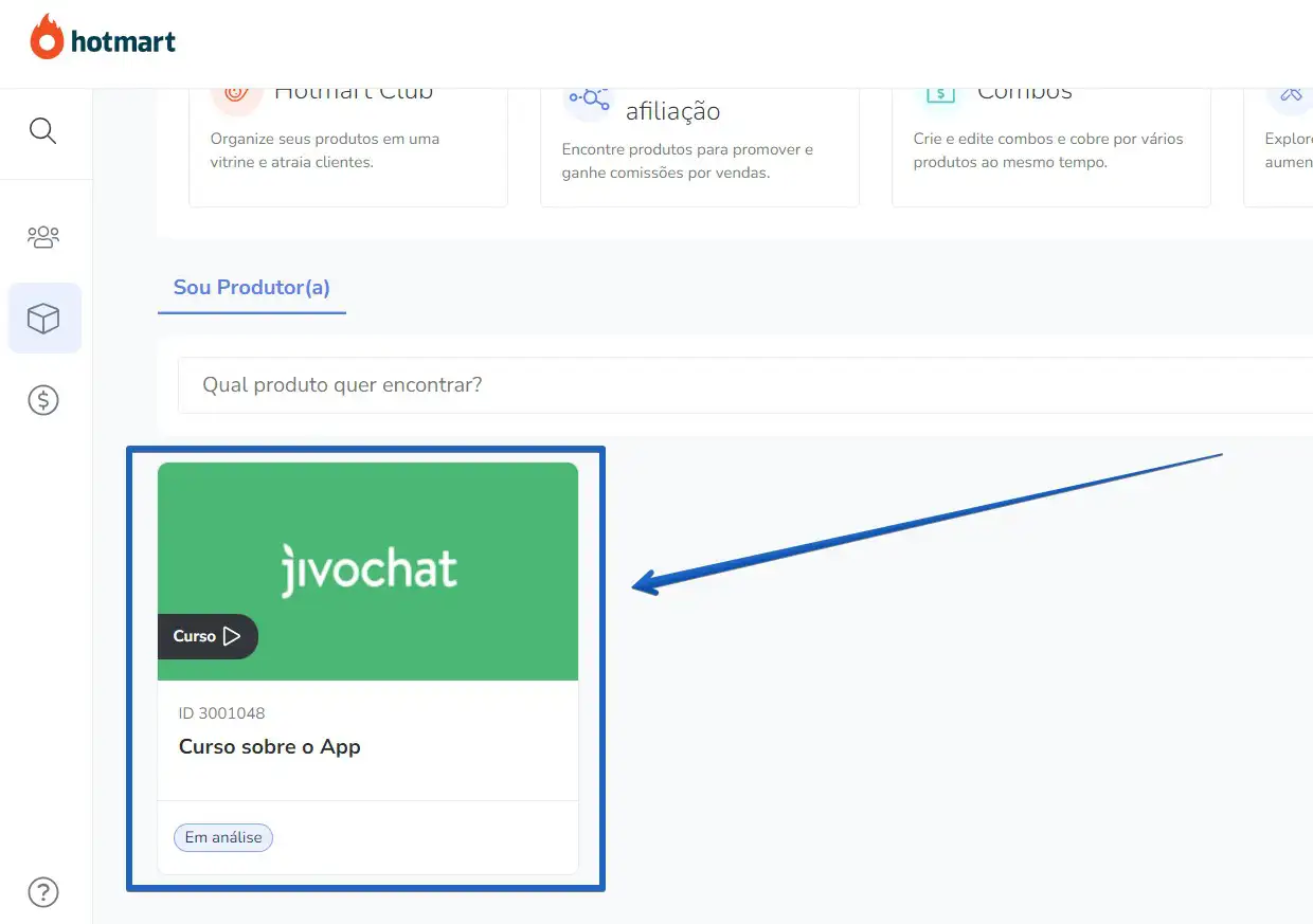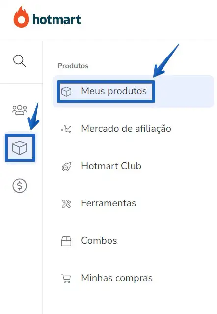 O próximo passo é ir ao painel da Hotmart e abrir a opção para colocar o chat no checkout. Faça o login na sua conta da Hotmart e clique em "Produtos" -> "Meus Produtos''